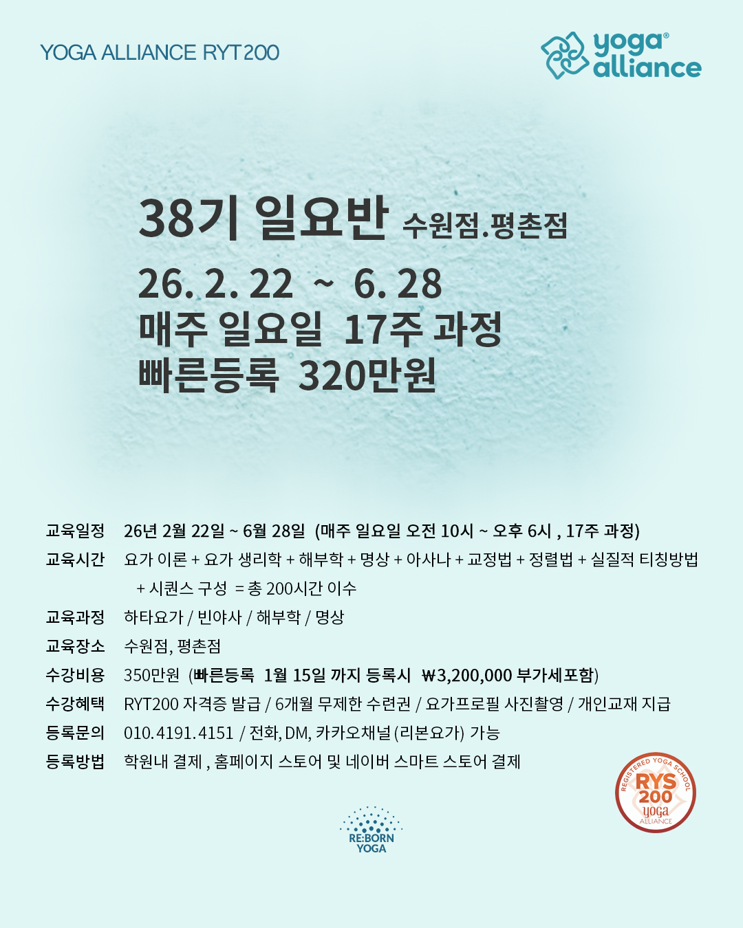 RYT200®국제 요가지도자과정 38기수원점, 평촌점 / 매주 일요일